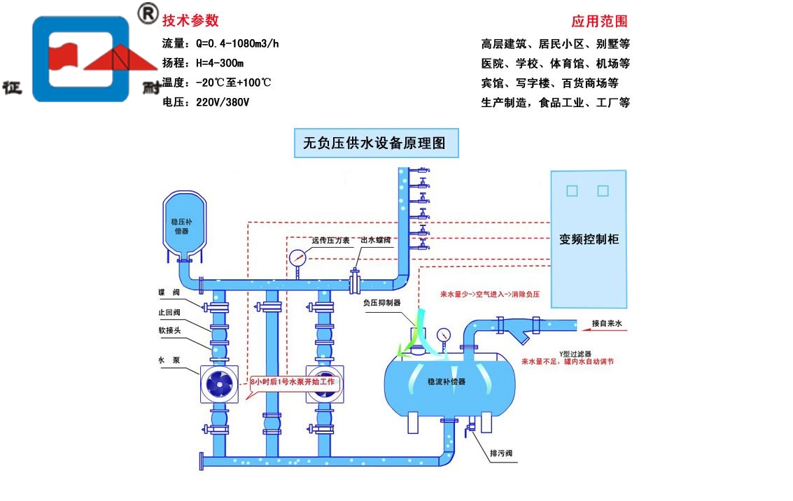CZWG智能無負壓供水設(shè)備是集 水力學(xué)、機械性能、智能化變頻節(jié)能控制、遠程監(jiān)控、穩(wěn)流防負壓技術(shù)于一身,具有節(jié)能、環(huán)保、衛(wèi)生、占地面積 小、經(jīng)濟實惠的變頻節(jié)能無負壓管網(wǎng)增壓穩(wěn)流給水設(shè)備。該設(shè)備按照國家標準GB/T26003-2010生產(chǎn),廣泛用于各 種高層樓宇、小區(qū)、大型賓館、商場以及工礦企事業(yè)單位的無污染的二次供水。