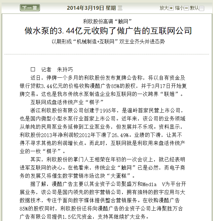 2014年利歐泵業(yè)發(fā)布復(fù)牌公告稱,將以自有資金及銀行貸款3.44億元的價(jià)格收購漫酷廣告85%的股權(quán),并于3月17日開始復(fù)牌交易。這也是我市傳統(tǒng)水泵制造企業(yè)和互聯(lián)網(wǎng)的一次跨界“聯(lián)姻”。下面是當(dāng)時(shí)的報(bào)紙報(bào)道: