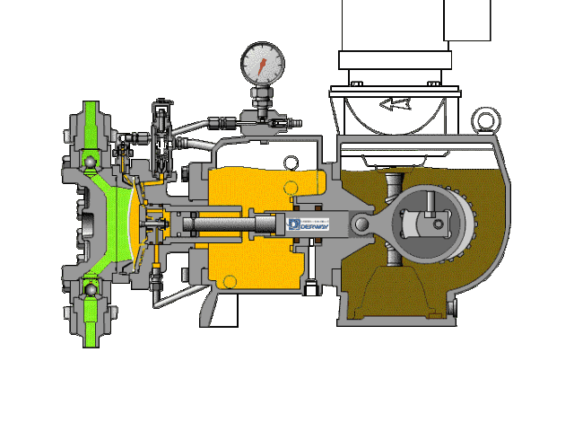 隔膜泵的缸蓋主要由隔膜隔開,以將待輸送的液體與工作流體分開。當(dāng)隔膜移動(dòng)到傳動(dòng)機(jī)構(gòu)的一側(cè)時(shí),泵缸中的工作室會(huì)在負(fù)壓下抽吸液體。當(dāng)隔膜移動(dòng)到另一側(cè)時(shí),然后排出液體。待輸送的液體通過泵缸中的隔膜與工作流體分離,并且僅與泵缸,吸入閥,排放閥和隔膜的內(nèi)側(cè)接觸,而沒有與柱塞和密封裝置接觸,因此重要部件例如塞子完全在含油介質(zhì)中工作,并且可以處于良好的工作狀態(tài)。下圖顯示了隔膜泵的工作狀態(tài)。